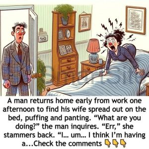 A man returns home early from work one afternoon to find his wife spread out on the bed, puffing and panting.